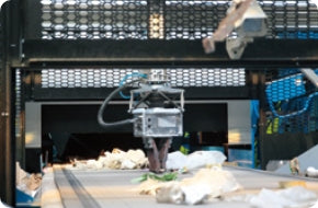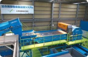 Rough sorting/AI automatic sortingAll mixed waste brought to our company is separated by type in the sorting building. After rough sorting using heavy machinery, automatic sorting is performed using AI, and the waste is ultimately sorted into eight types of waste.