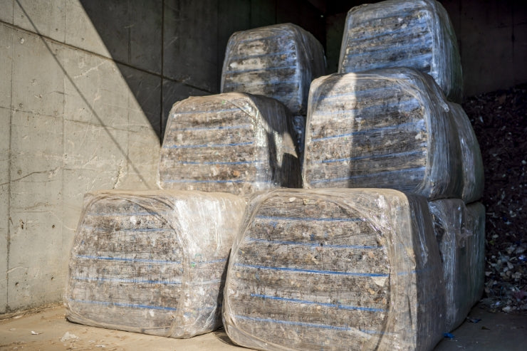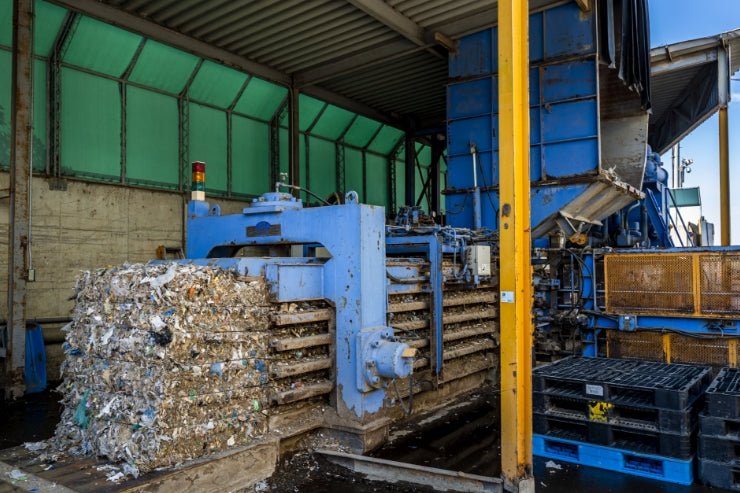 The sorted cardboard, paper waste, fiber waste, and plastics are processed in a compression building and shipped as raw materials for recycled paper or fluff fuel.