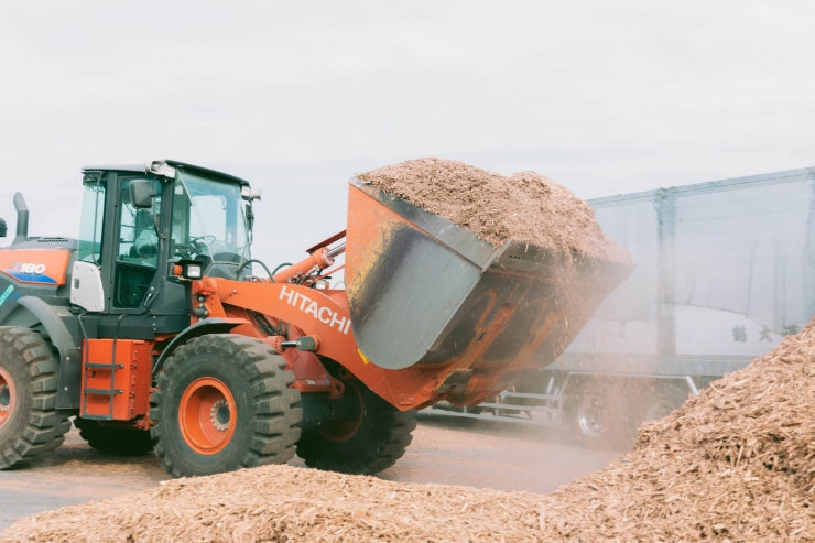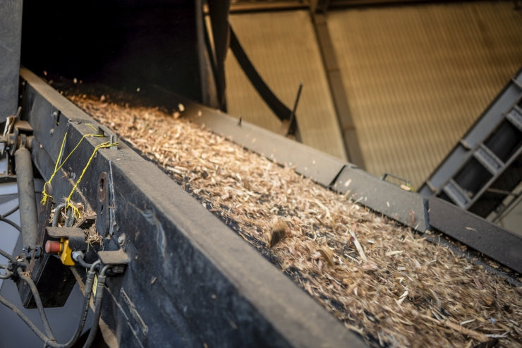 We process and store wood chips received from contractors. The wood is sieved using a machine to make it even in size, and then separated into wood chips and powder. The powder is a raw material for cement.